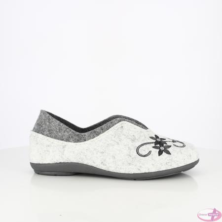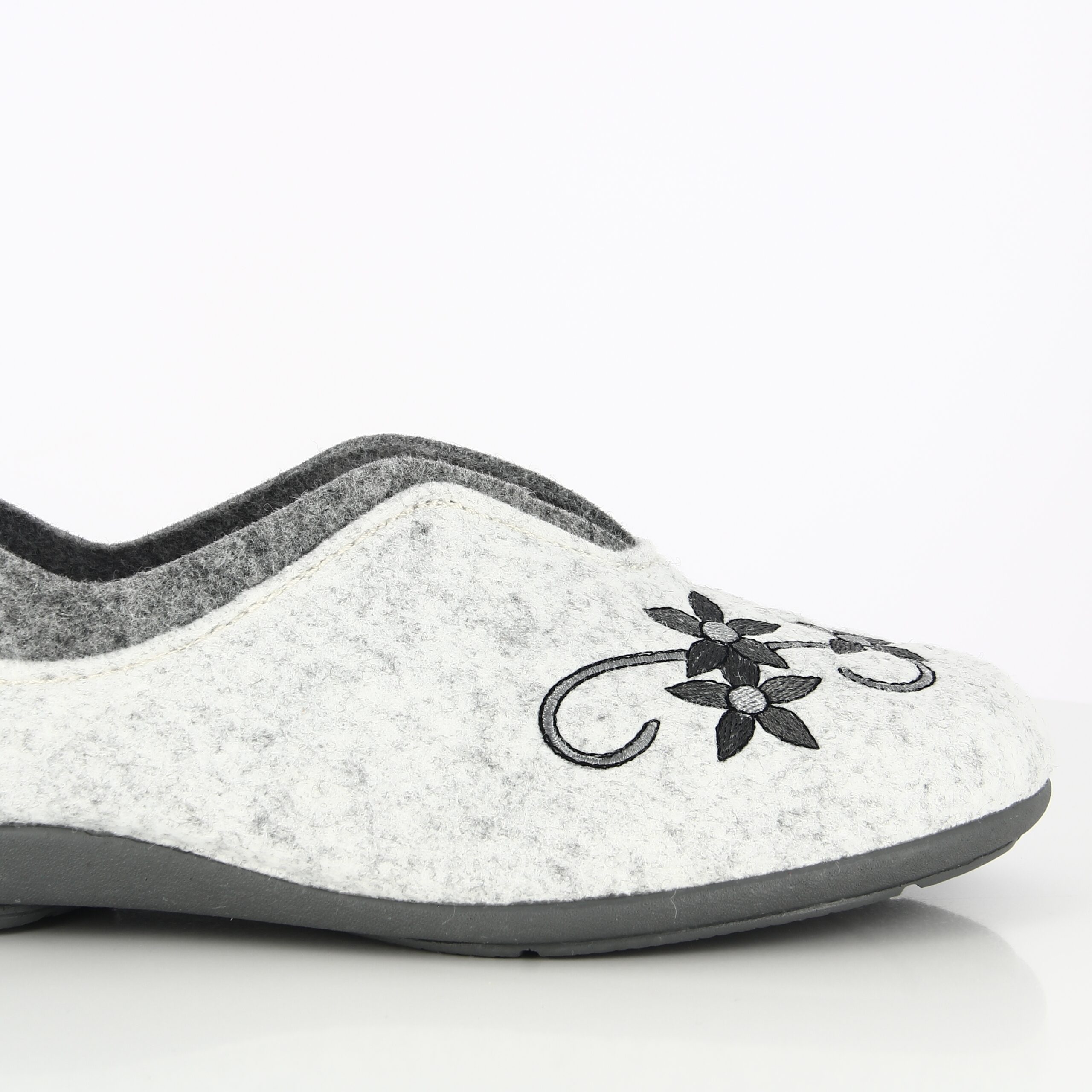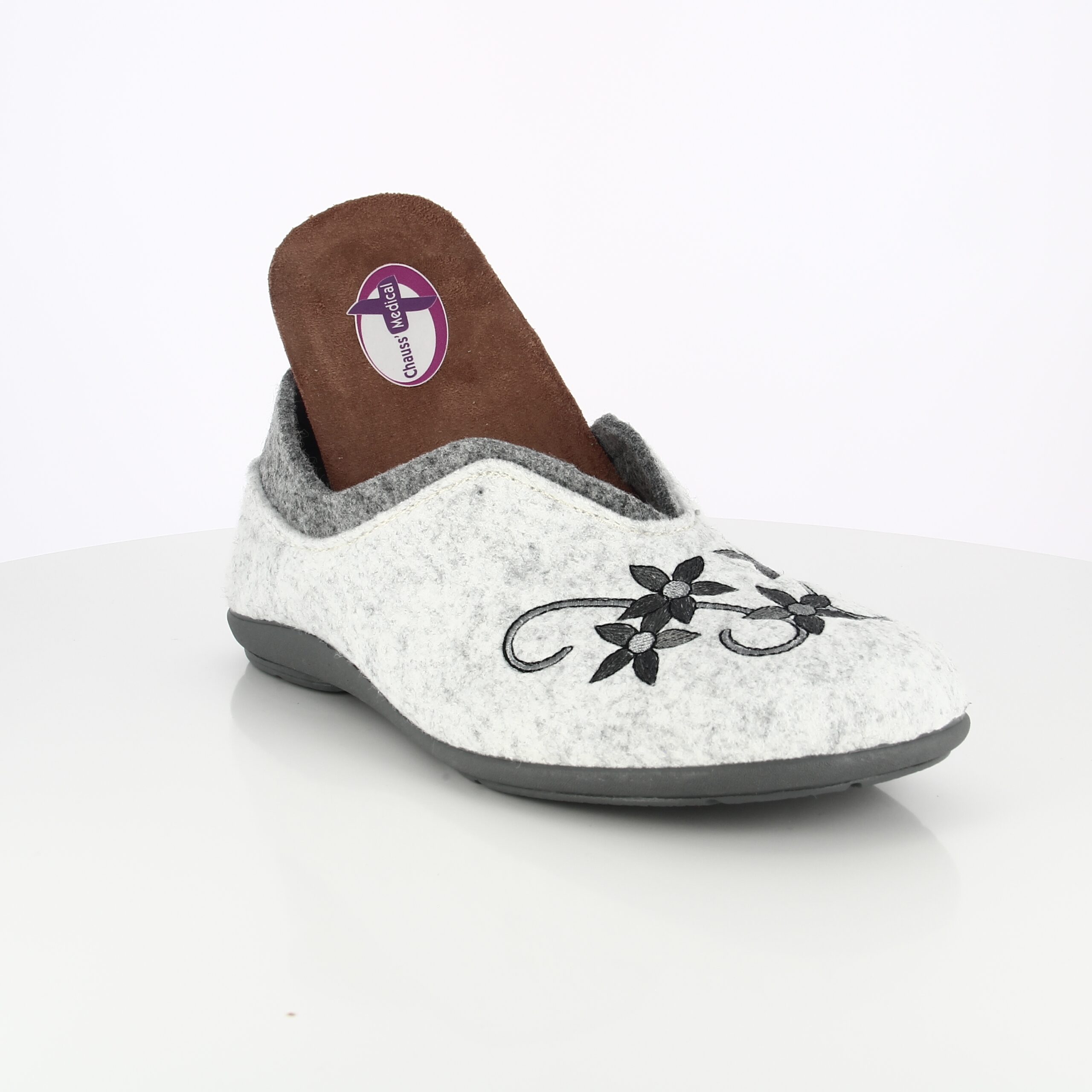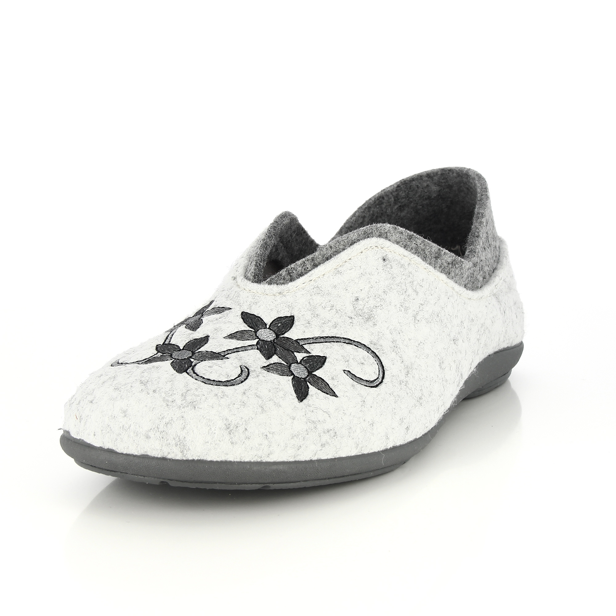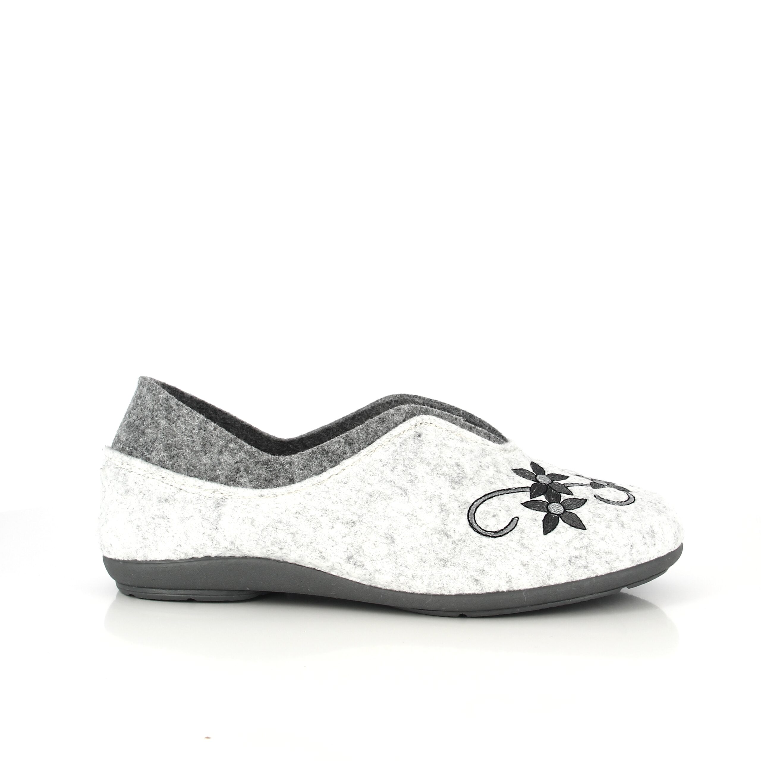 Le joli motif floral en tons de gris en fait un chausson de tous les jours, agréable et facile à porter.